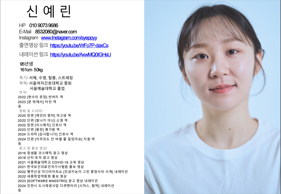 이름 신예린 | 키 161 | 몸무게 50 | 생년월일 1995.04.28 | 소속사 X